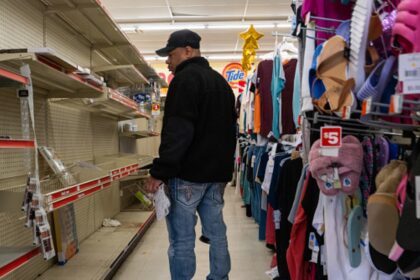 The shelves of a dollar store rise on April 1, 2024 in Lansing, Michigan, USA.Spencer…