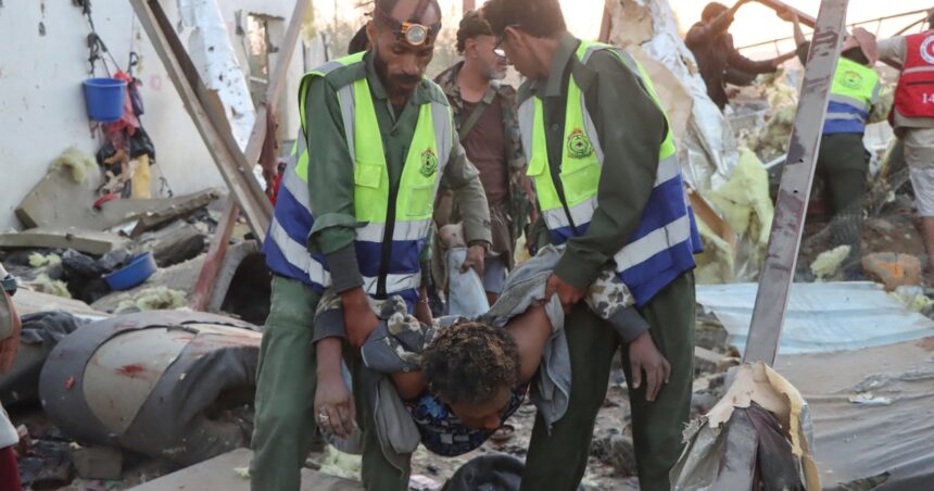Rescuers take an injured African migrant after a strike in the United States purely beaten in a detention center that houses African migrants, in Saada, Yemen, on April 28, 2025.